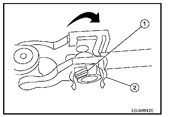 c. Rotate the cam nut to direction (A). Align the cam nut V-shaped groove (1) with the holder (2) V-guide. Fit the cam nut to the holder V-guide, then remove the cam nut from the holder.