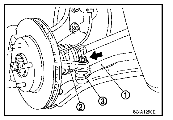 6. Remove steering outer socket (1) from steering knuckle (2) so as not to damage ball joint boot (3) using the ball joint remover (suitable tool).