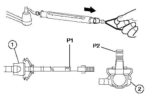 ^ Hook a spring balance at the points P1, P2 as shown and pull the spring balance. Make sure that the spring balance reads the specified value when ball stud and inner socket start to move. Replace inner socket (1) and outer socket (2) if they are outside the standard.
