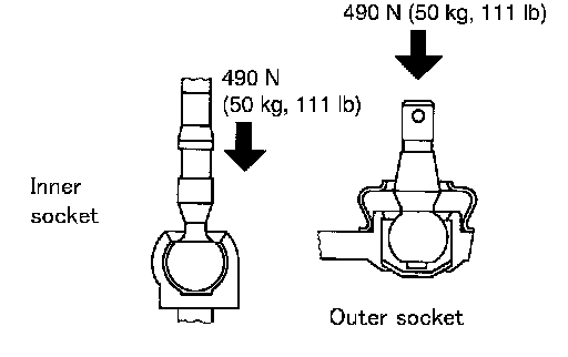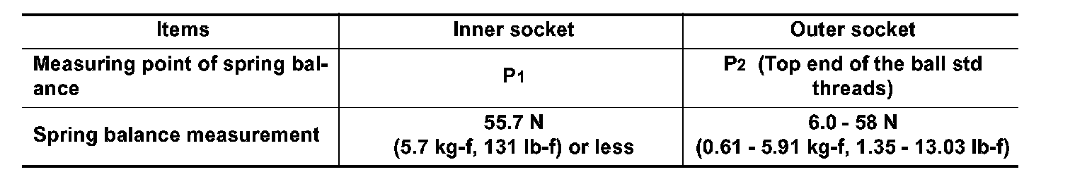 ^ Apply an axial load of 490 N (50 kg-f, 111 lb-f) to ball stud using a dial gauge. Measure amount of stud movement, and then make sure that the value is within the specified range. Replace outer socket and inner socket if the measured value is outside the standard.