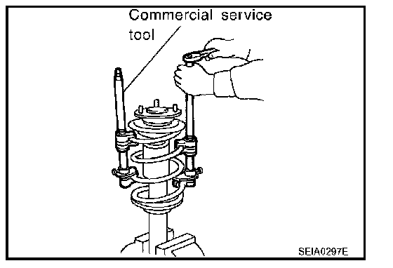 2. Using tool, compress coil spring between strut mounting bearing and spring lower seat (on strut) until coil spring is free.