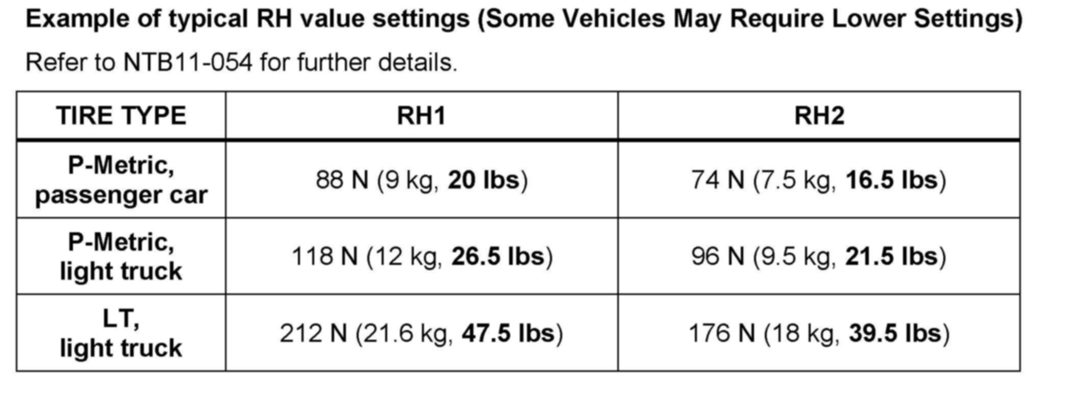 Example of typical RH value settings (Some Vehicles May Require Lower Settings)