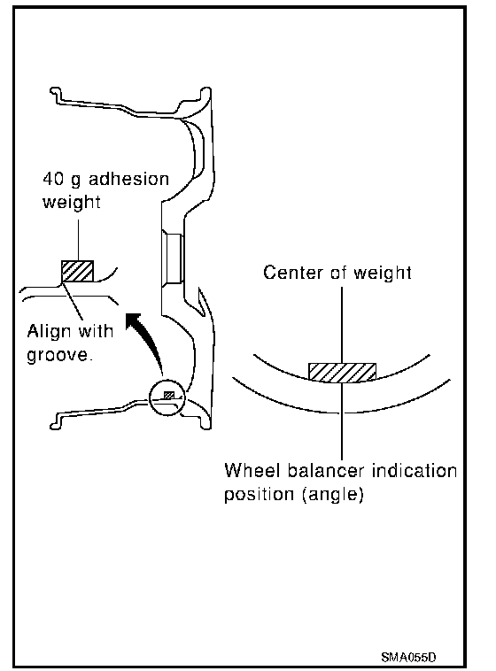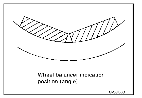 b. When installing balance weight to wheels, set it into the grooved area on the inner wall of the wheel as shown so that the balance weight center is aligned with the wheel balancer indication position (angle).