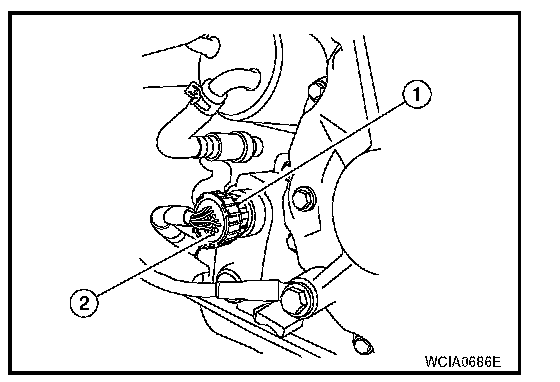 Rotate bayonet ring (1) counterclockwise, pull out CVT unit harness connector (2) outward and disconnect it.