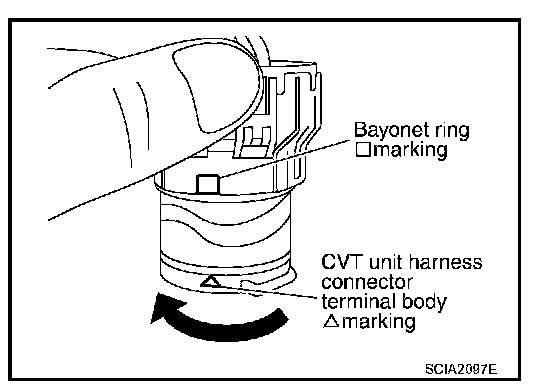 1. Align CVT unit harness connector terminal body marking with bayonet ring marking, insert CVT unit harness connector, and then rotate bayonet ring clockwise.