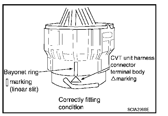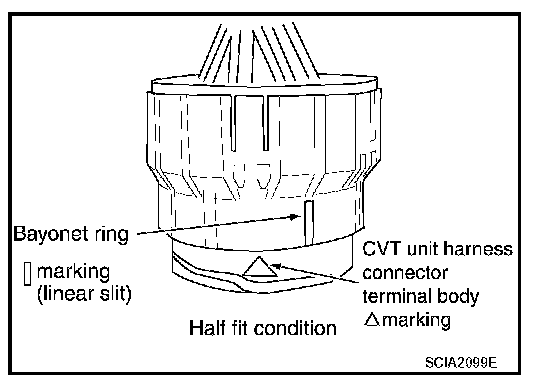 ^ Securely align CVT unit harness connector terminal body marking with bayonet ring marking (linear slit). Do not make a half fit condition as shown.