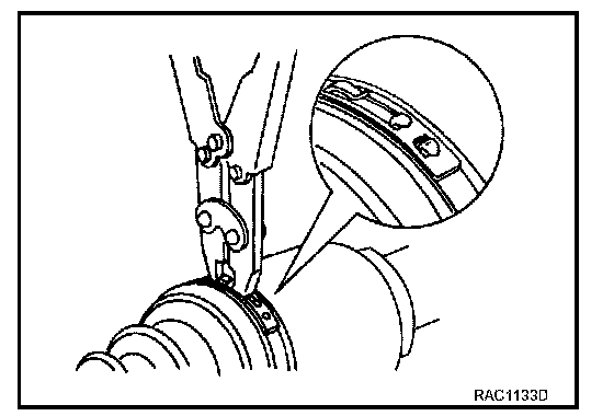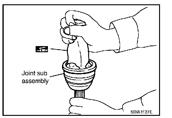 1. Insert recommended grease (Genuine NISSAN Grease or equivalent) into joint sub-assembly serration hole until grease begins to ooze from ball groove and serration hole. After inserting grease, use a shop cloth to wipe off old grease that has oozed out.