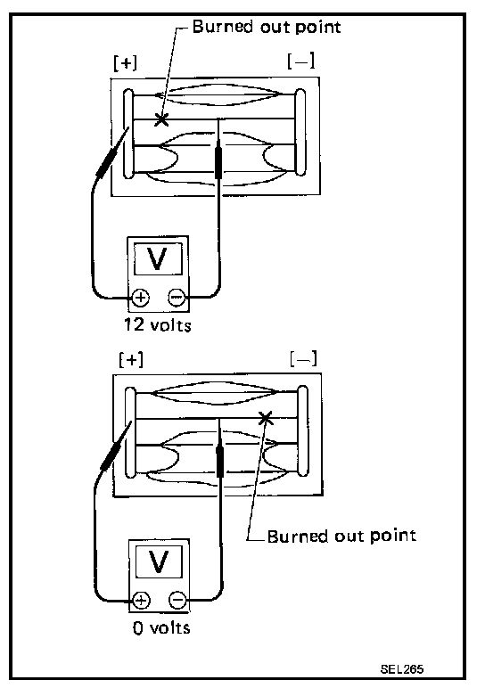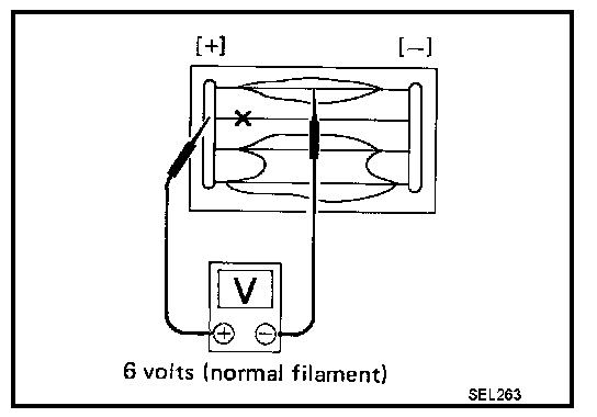 2. Attach probe circuit tester (in Volt range) to middle portion of each filament.
