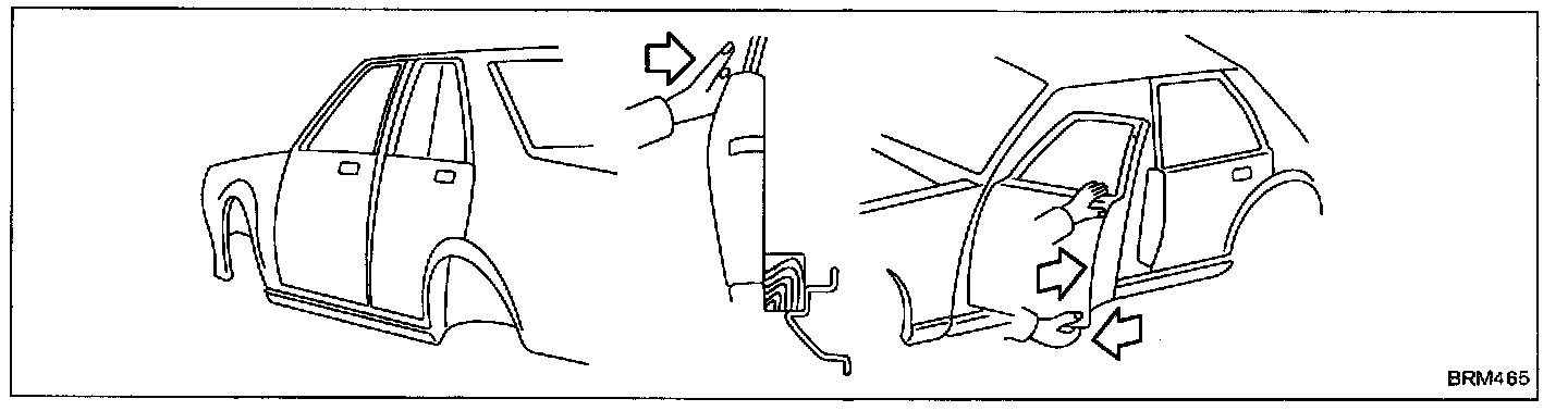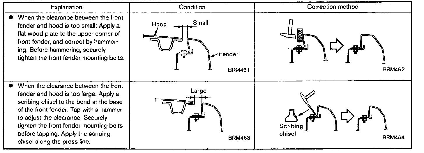Fitting adjustment means adjustment of clearance or gradient of the hood, door, front fender, etc. with respect to its adjacent part, and adjustment of gradient at the press line.