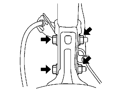 2. Without disassembling the hydraulic lines, remove the torque member bolts using power tool. Then reposition the torque member and brake caliper assembly aside with wire. Refer to Front Disc Brake.