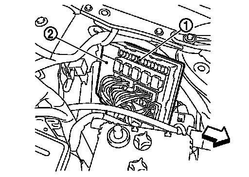 7. Remove fuel pump fuse (1) in IPDM E/R (2) to release fuel pressure.