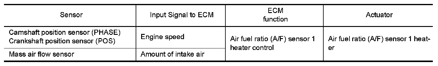 The ECM performs ON/OFF duty control of the A/F sensor 1 heater corresponding to the engine operating condition to keep the temperature of A/F sensor 1 element at the specified range.