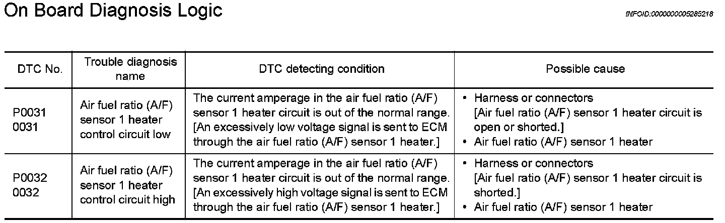 DTC P0031, P0032 A/F SENSOR 1 HEATER