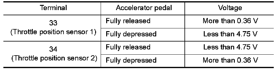 5. Check voltage between ECM terminals 33 (TP sensor 1 signal), 34 (TP sensor 2 signal) and ground under the following conditions.