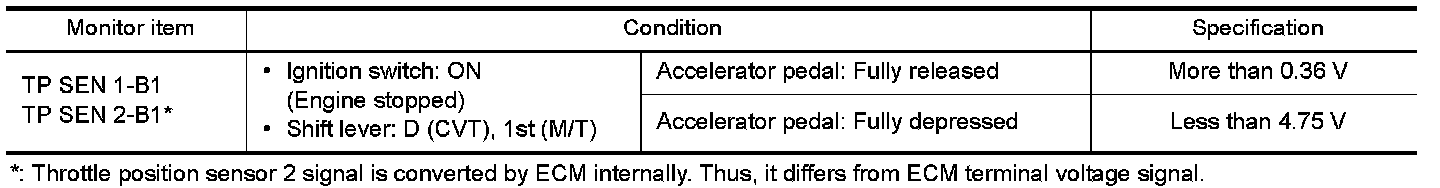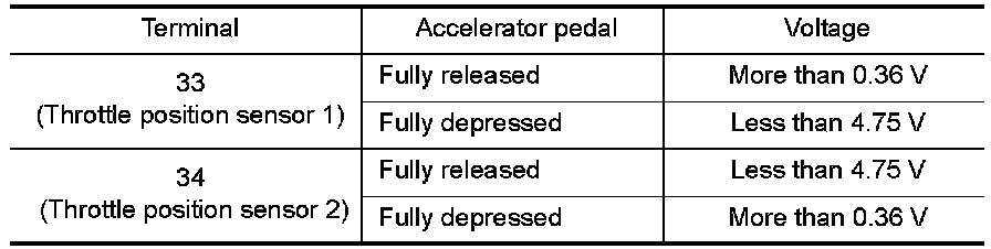 5. Check voltage between ECM terminals 33 (TP sensor 1 signal), 34 (TP sensor 2 signal) and ground under the following conditions.