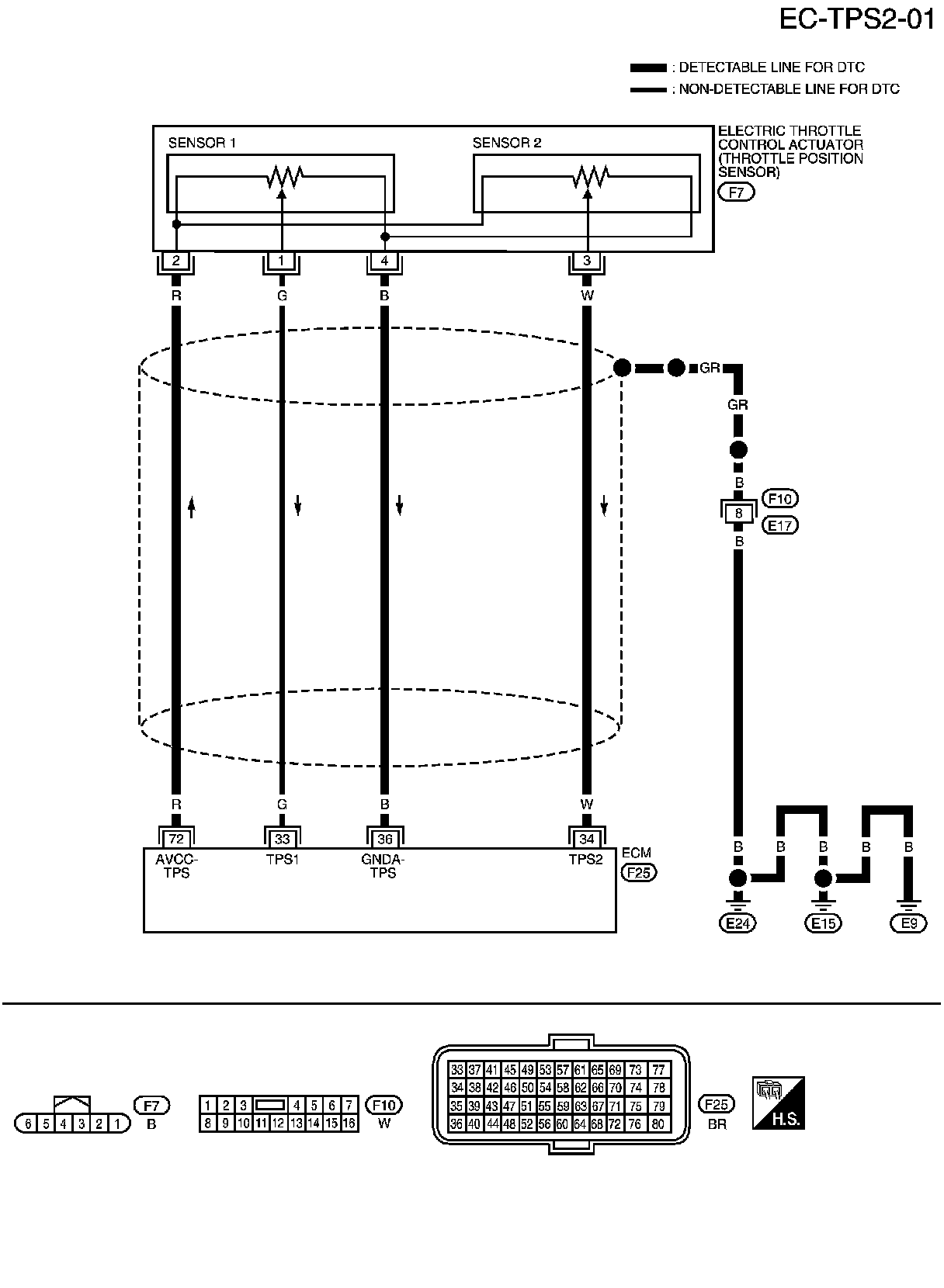 The throttle position sensor has two sensors. These sensors are a kind of potentiometers which transform the throttle valve position into output voltage, and emit the voltage signal to the ECM. In addition, these sensors detect the opening and closing speed of the throttle valve and feed the voltage signals to the ECM. The ECM judges the current opening angle of the throttle valve from these signals and the