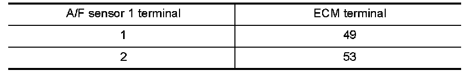 4. Check harness continuity between ECM terminals 49, 53 or A/F sensor 1 terminals 1, 2 and ground. Refer to Wiring Diagram.