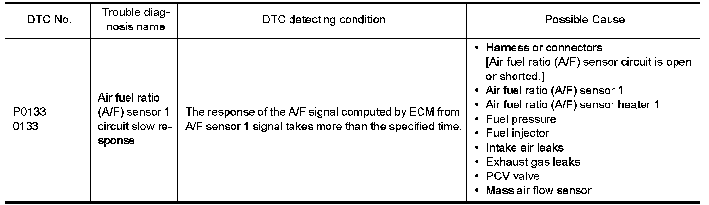 To judge the malfunction of air fuel ratio (A/F) sensor 1, this diagnosis measures response time of the A/F signal computed by ECM from the air fuel ratio (A/F) sensor 1 signal. The time is compensated by engine operating (speed and load), fuel feedback control constant, and the air fuel ratio (A/F) sensor 1 temperature index.