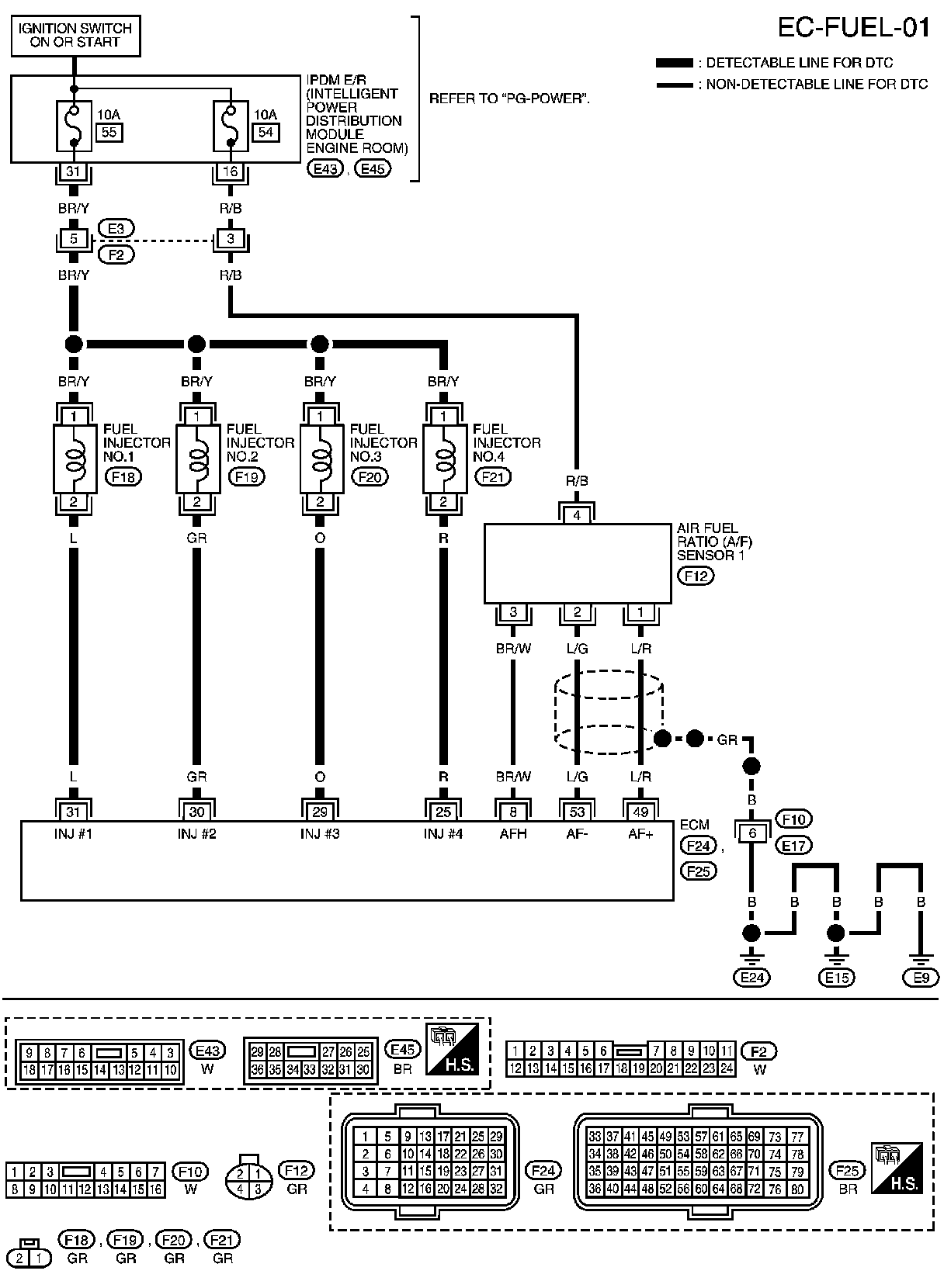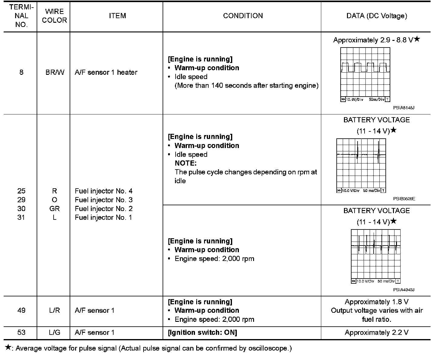 5. Check harness continuity between ECM terminals 49, 53 or A/F sensor 1 terminals 1, 2 and ground. Refer to Wiring Diagram.