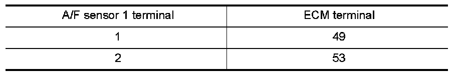 5. Check harness continuity between ECM terminals 49, 53 or A/F sensor 1 terminals 1, 2 and ground. Refer to Wiring Diagram.