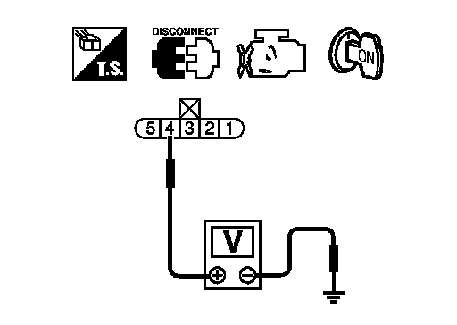 3. Check voltage between "fuel level sensor unit and fuel pump" terminal 4 and ground with CONSULT-III or tester.