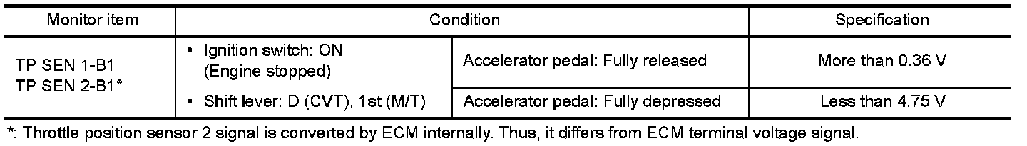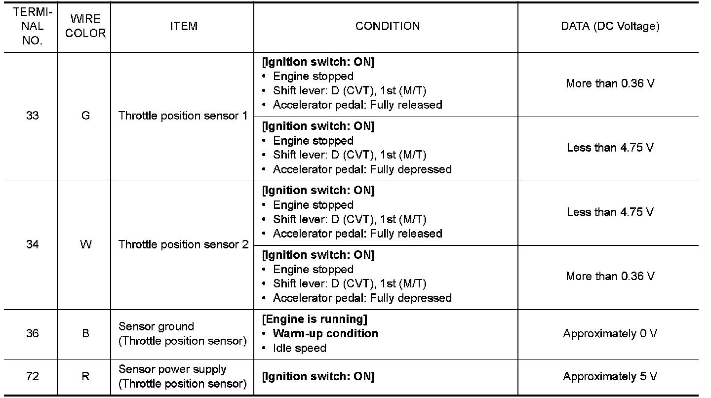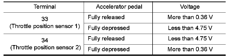 5. Check voltage between ECM terminals 33 (TP sensor 1 signal), 34 (TP sensor 2 signal) and ground under the following conditions.