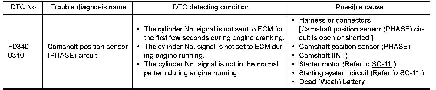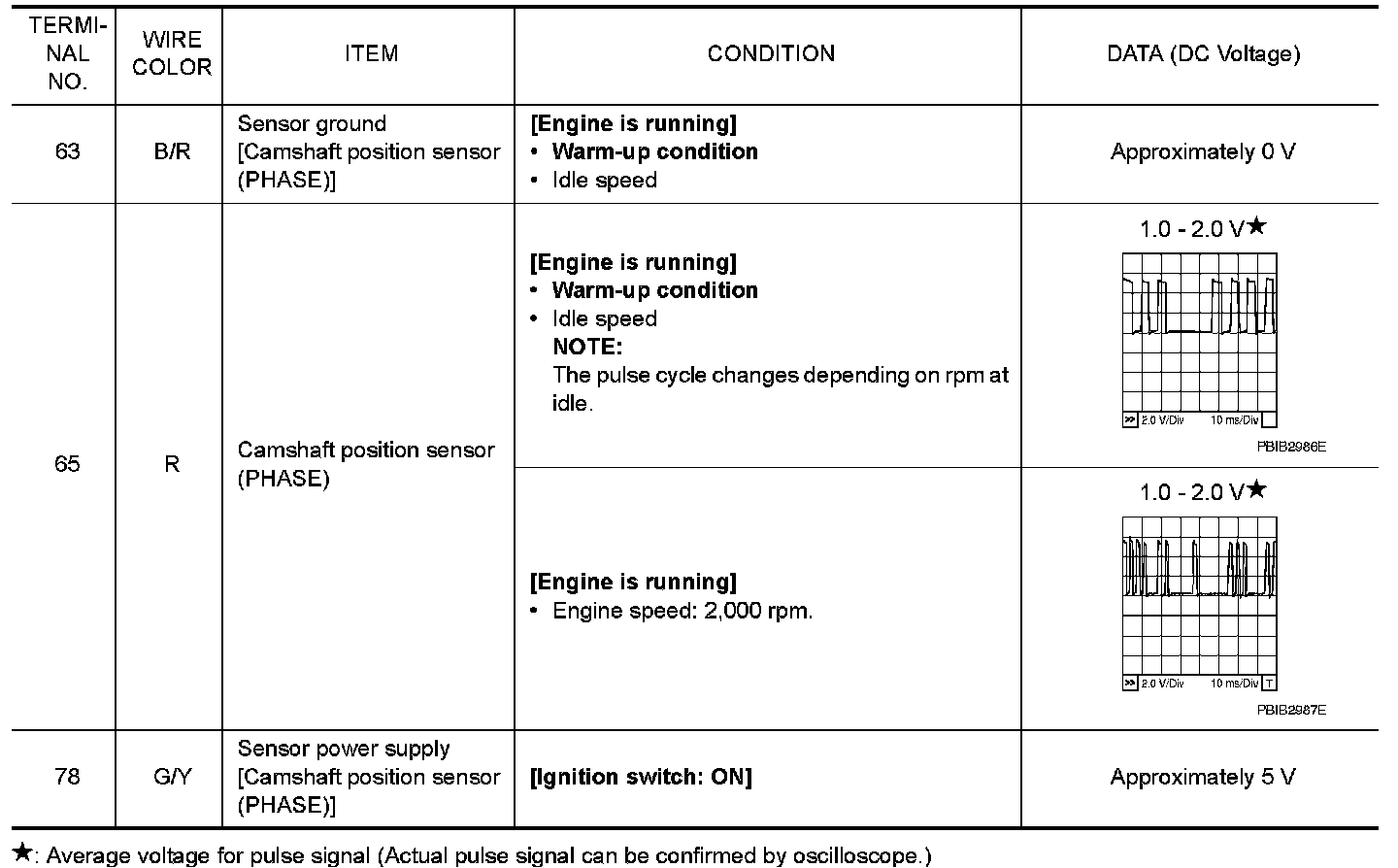 The camshaft position sensor (PHASE) senses the protrusion of camshaft (INT) to identify a particular cylinder. The camshaft position sensor (PHASE) senses the piston position. When the crankshaft position sensor (POS) system becomes inoperative, the camshaft position sensor (PHASE) provides various controls of engine parts instead, utilizing timing of cylinder identification signals. The sensor consists of a permanent magnet and Hall IC. When engine is running, the high and low parts of the teeth cause the gap with the sensor to change. The changing gap causes the magnetic field near the sensor to change. Due to the changing magnetic field, the voltage from the sensor changes.