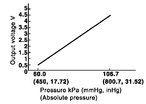 The EVAP control system pressure sensor (1) detects pressure in the purge line. The sensor output voltage to the ECM increases as pressure increases.