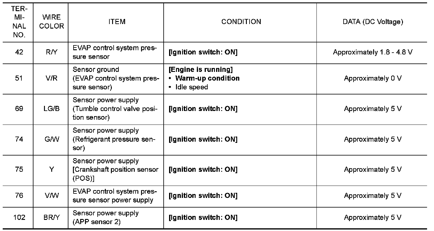 3. Turn ignition switch ON and check output voltage between ECM terminal 42 and ground under the following conditions.