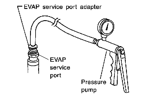 3. Pressurize the EVAP line using pressure pump with 1.3 to 2.7 kPa (10 to 20 mmHg, 0.39 to 0.79 inHg), then remove pump and EVAP service port adapter.