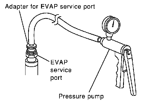 3. Pressurize the EVAP line using pressure pump with 1.3 to 2.7 kPa (10 to 20 mmHg, 0.39 to 0.79 inHg), then remove pump and EVAP service port adapter.
