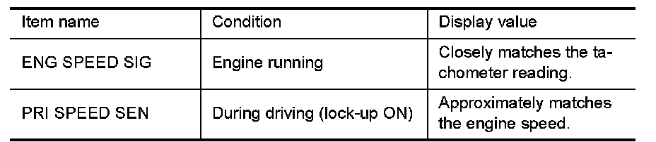 4. Check if there is a great difference between "ENG SPEED SIG" and "PRI SPEED SEN". (Lock-up ON.)