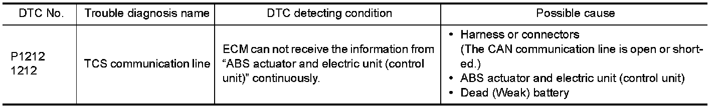 This CAN communication line is used to control the smooth engine operation during the TCS operation. Pulse signals are exchanged between ECM and "ABS actuator and electric unit (control unit)".