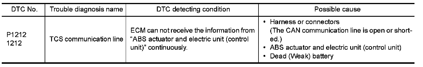 This CAN communication line is used to control the smooth engine operation during the TCS operation. Pulse signals are exchanged between ECM and "ABS actuator and electric unit (control unit)".