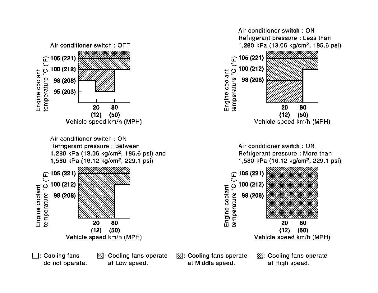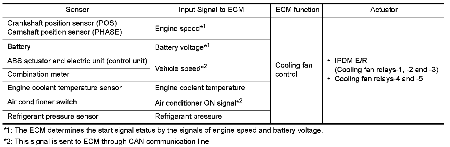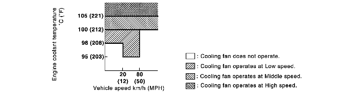The ECM controls the cooling fan corresponding to the vehicle speed, engine coolant temperature, refrigerant pressure, and air conditioner ON signal. The control system has 4-step control [HIGH/MIDDLE/LOW/OFF].