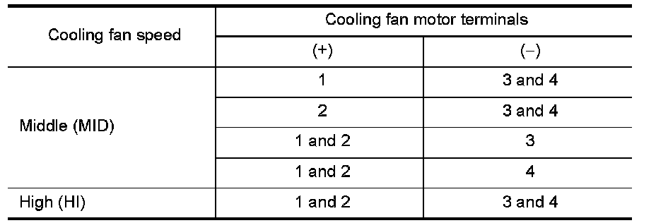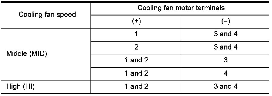 The cooling fan operates at each speed when the current flows in the cooling fan motor as follows.