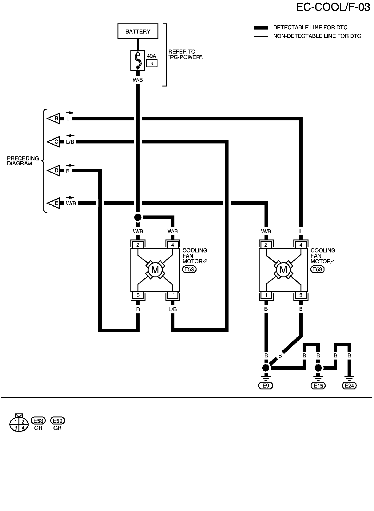 cooling fan relay-4 terminal 5 and cooling fan motor-2 terminal 1, cooling fan relay-5 terminal 3 and cooling fan motor-2 terminal 3, cooling fan motor-2 terminal 1 and cooling fan relay-4 terminal 5, Refer to Wiring Diagram.