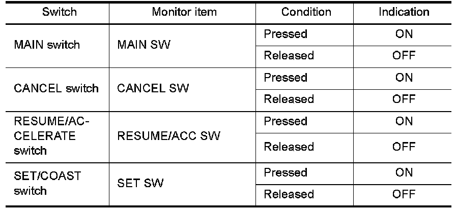 2. Select "MAIN SW", "RESUME/ACC SW", "SET SW and "CANCEL SW" in "DATA MONITOR" mode with