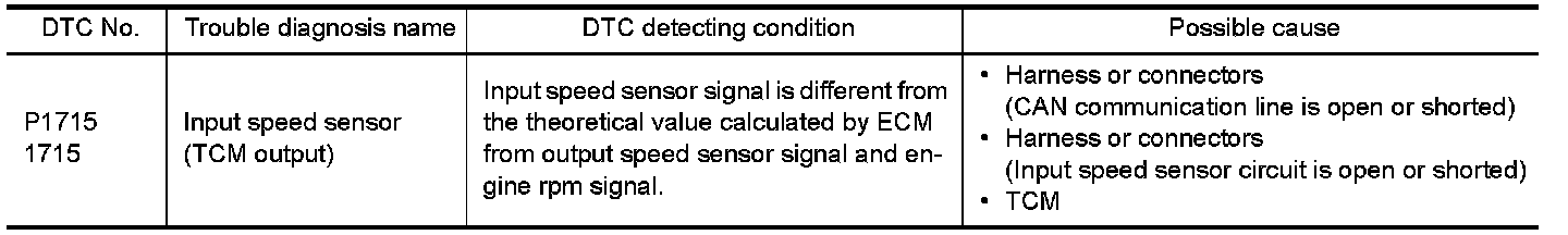 - If DTC P1715 is displayed with DTC UXXXX, first perform the trouble diagnosis for DTC UXXXX.