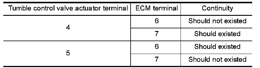 3. Check harness continuity between tumble control valve actuator terminal 2 and ECM terminal 47. Refer to Wiring Diagram.