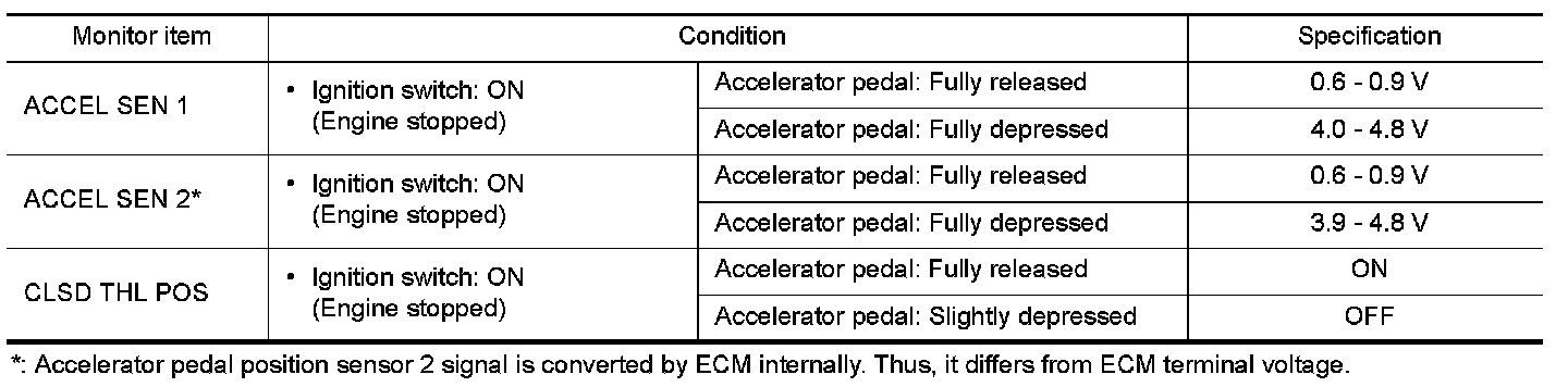 Idle position of the accelerator pedal is determined by the ECM receiving the signal from the accelerator pedal position sensor. The ECM uses this signal for the engine operation such as fuel cut.