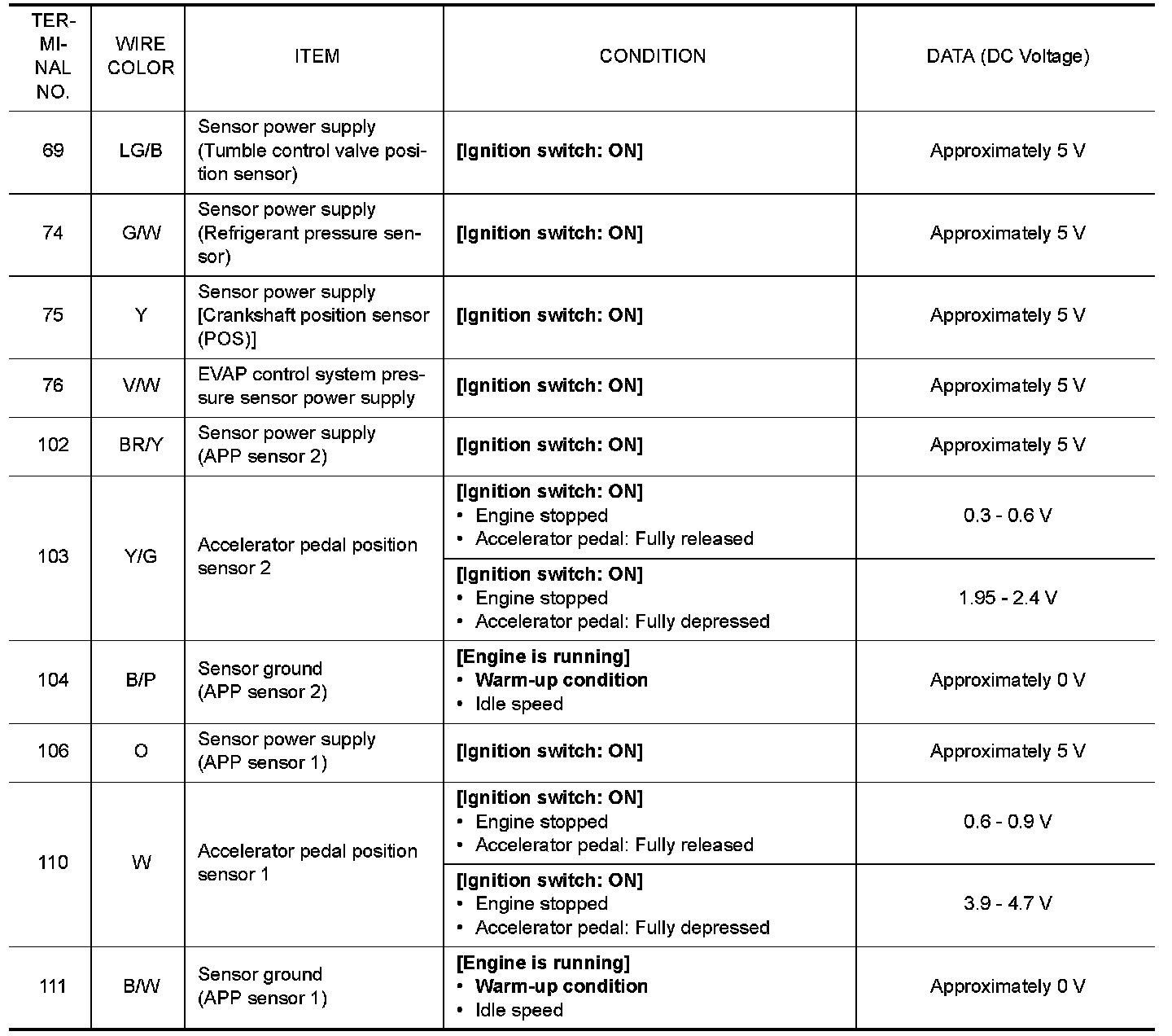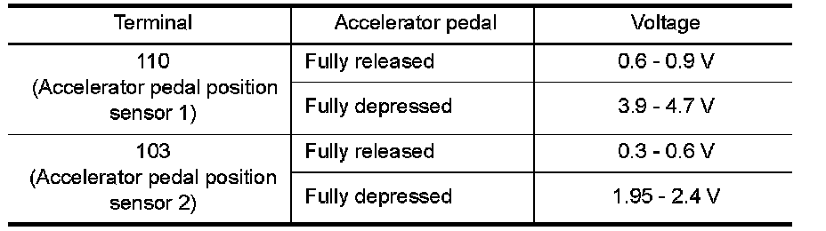 3. Check voltage between ECM terminals 110 (APP sensor 1 signal), 103 (APP sensor 2 signal) and ground under the following conditions.