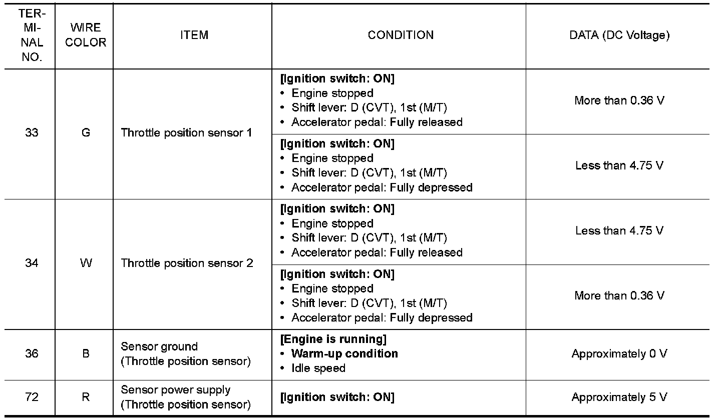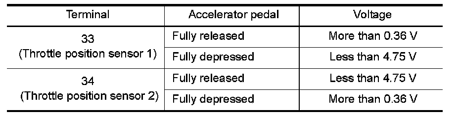 5. Check voltage between ECM terminals 33 (TP sensor 1 signal), 34 (TP sensor 2 signal) and ground under the following conditions.