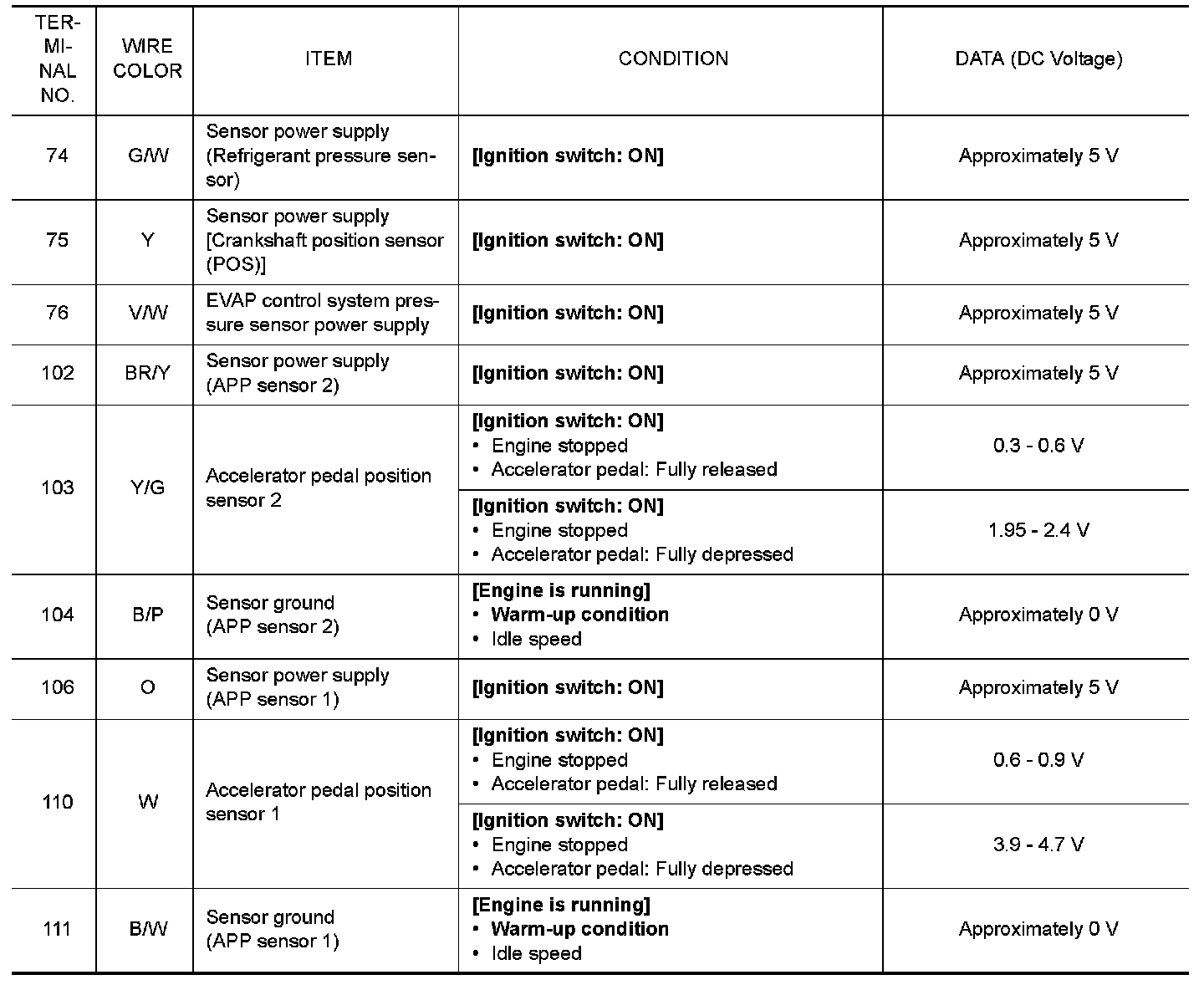 3. Check voltage between ECM terminals 110 (APP sensor 1 signal), 103 (APP sensor 2 signal) and ground under the following conditions.