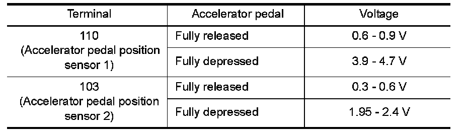 3. Check voltage between ECM terminals 110 (APP sensor 1 signal), 103 (APP sensor 2 signal) and ground under the following conditions.