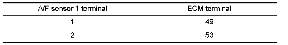 4. Check harness continuity between ECM terminals 49, 53 or A/F sensor 1 terminals 1, 2 and ground. Refer to Wiring Diagram.