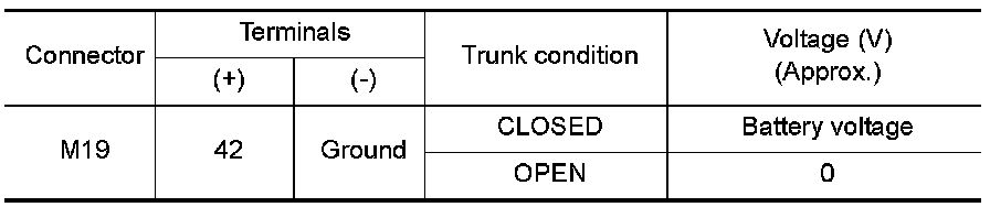 2. Check voltage between BCM harness connector M19 terminal 42 and ground.