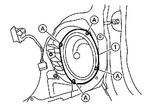 2. Remove the front door speaker screws (A), disconnect the front door speaker connector and remove the front door speaker (1).