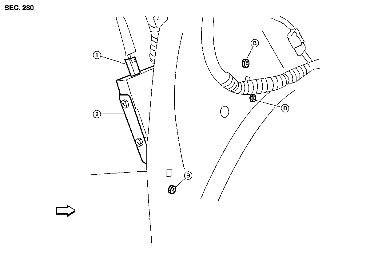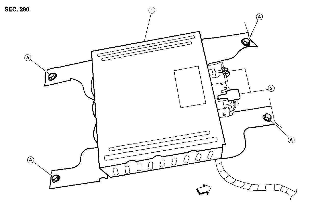 2. Slide the RH front seat toward the front to remove the audio amplifier rear bolts.