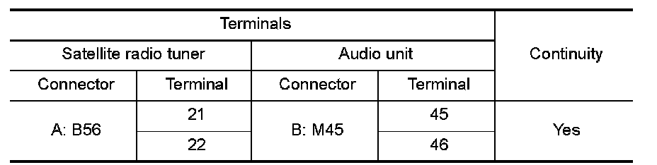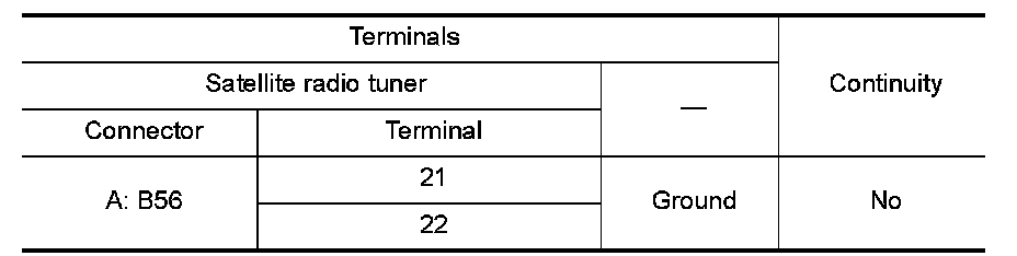 3. Check signal between satellite radio tuner connector B56 terminals 21 and 22 with CONSULT-III or oscilloscope.